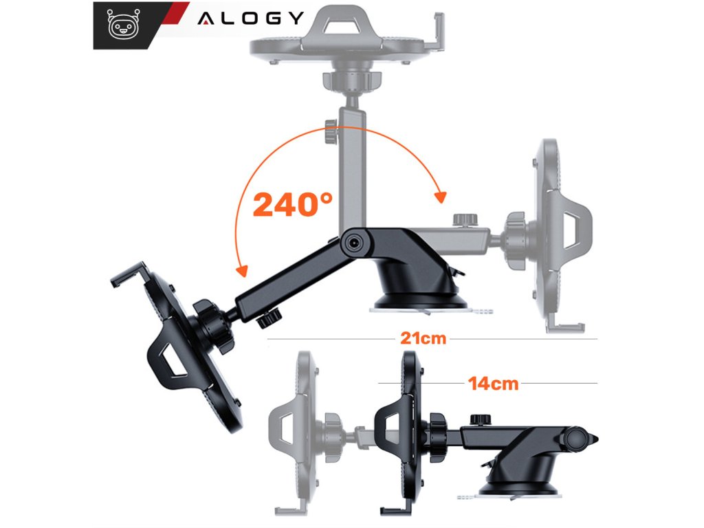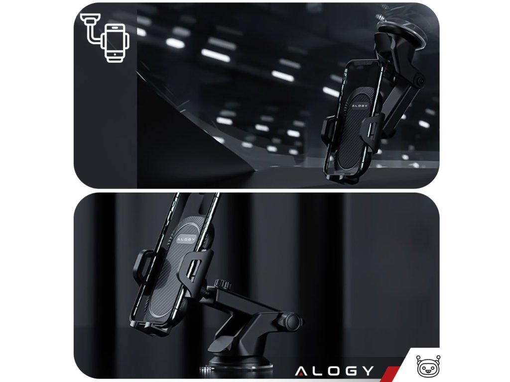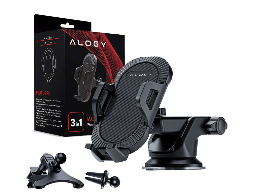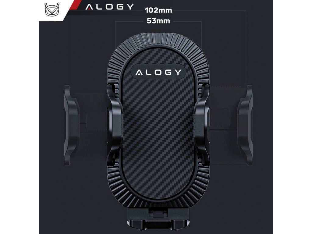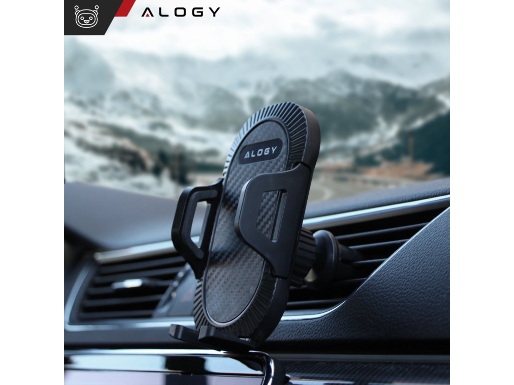 Držiak do auta od značky Alogy má stabilnú konštrukciu vyrobenú z kvalitného ABS a PC. Nastaviteľné ramená dokonale padnú na telefón a zaručujú bezpečné uchopenie. Mechanické tlačidlo na ramene nám umožní integrovať šírku držiaka smartfónu. Hlavu držiaka je možné ľubovoľne nastaviť, pretože má možnosť otáčania o 360 stupňov, vďaka čomu si môžeme nastaviť uhol obrazovky, ktorý nám vyhovuje.