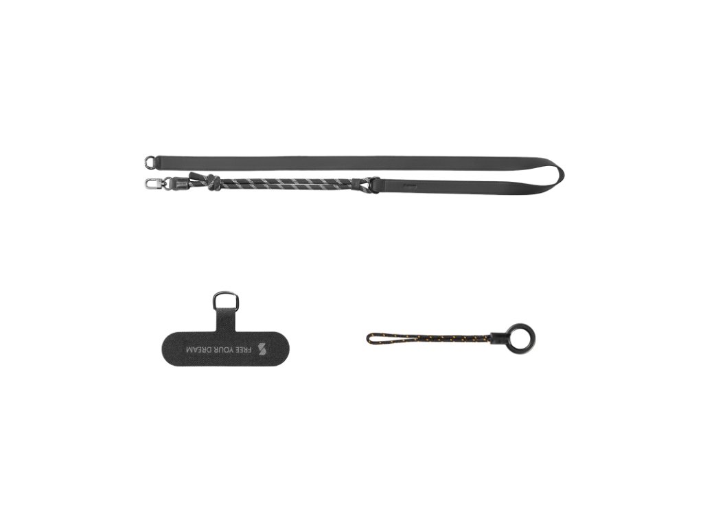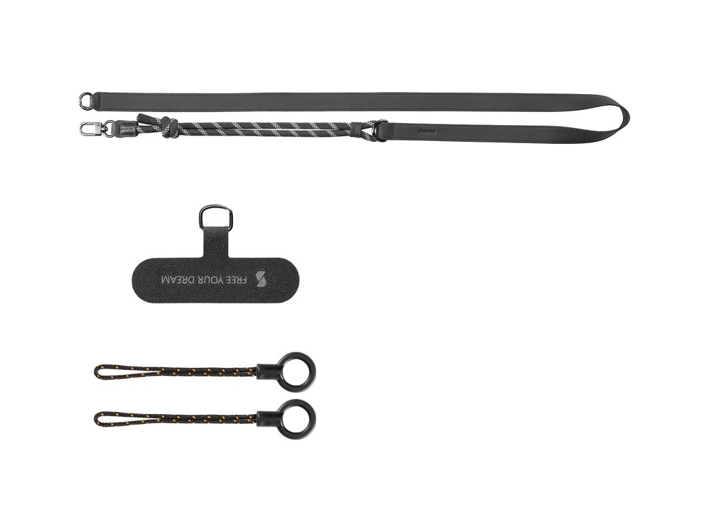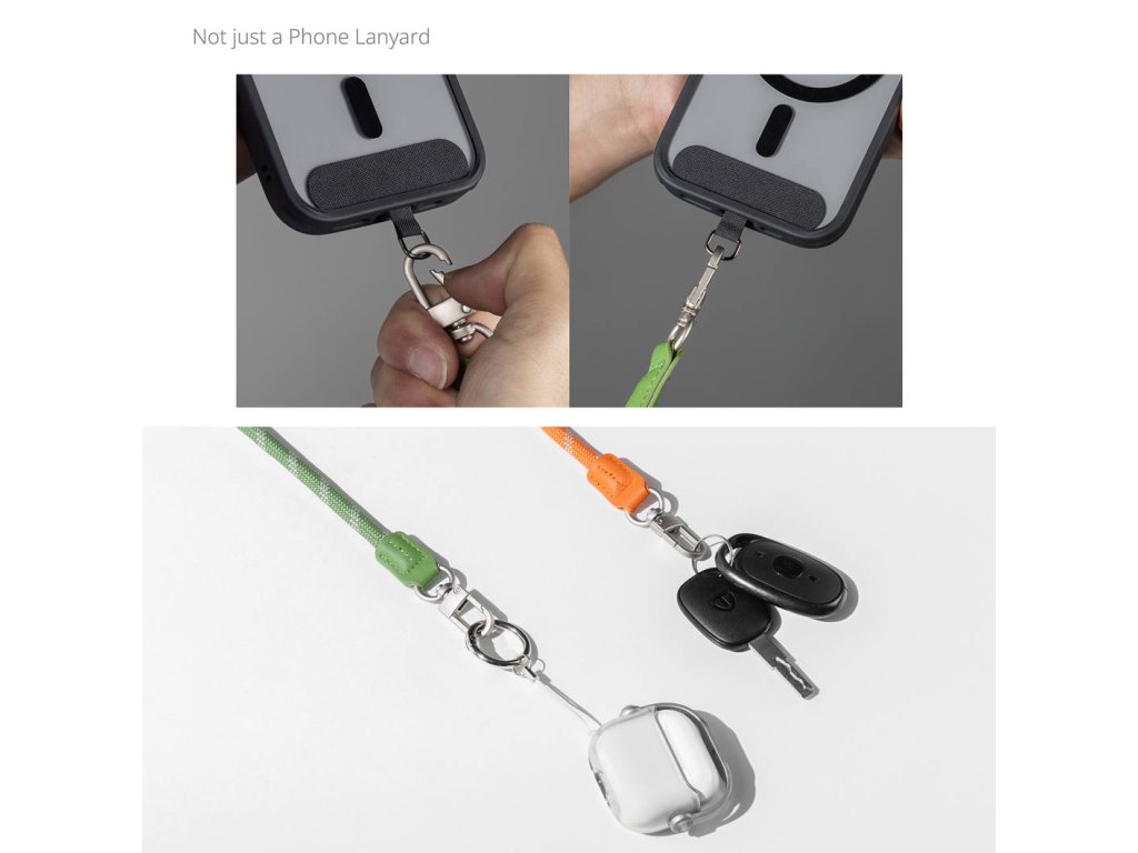 Minimalistický dizajn s peruánskym uzlom umožňuje nastavenie dĺžky, je vhodný na nosenie okolo krku alebo cez telo. Má viacúčelový závesný bod a spodný kovový háčik na pripevnenie príslušenstva, ako sú puzdrá na AirPods alebo kľúče. Balenie obsahuje dve šnúrky na krk a jednu podložku na upevnenie pre jednoduché pripevnenie k puzdrám na telefón, kompatibilné so všetkými puzdrami na celé telo alebo s otvormi na šnúrku na krk.
